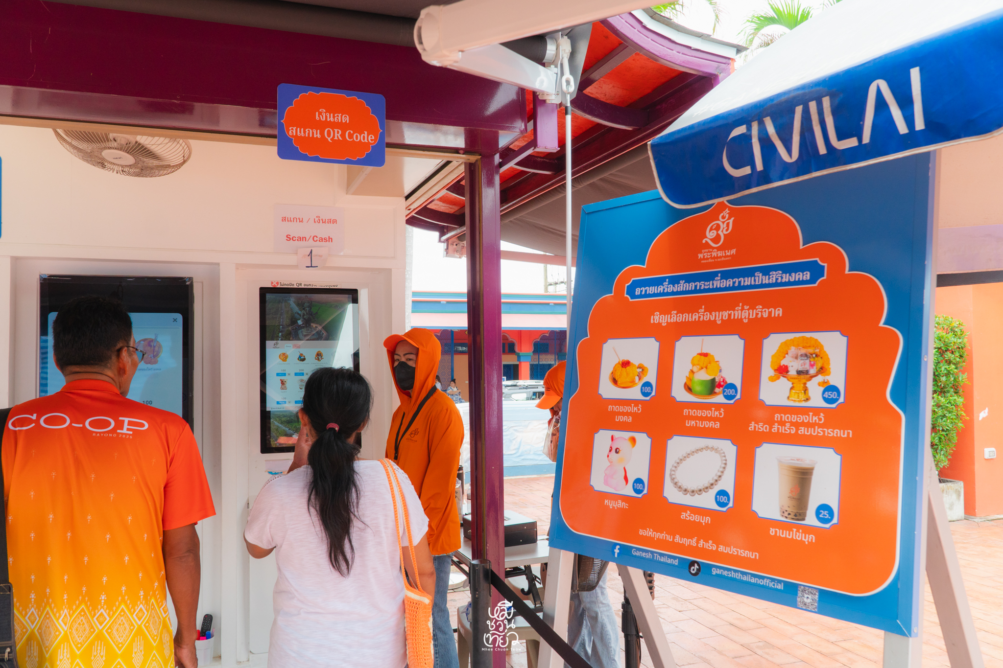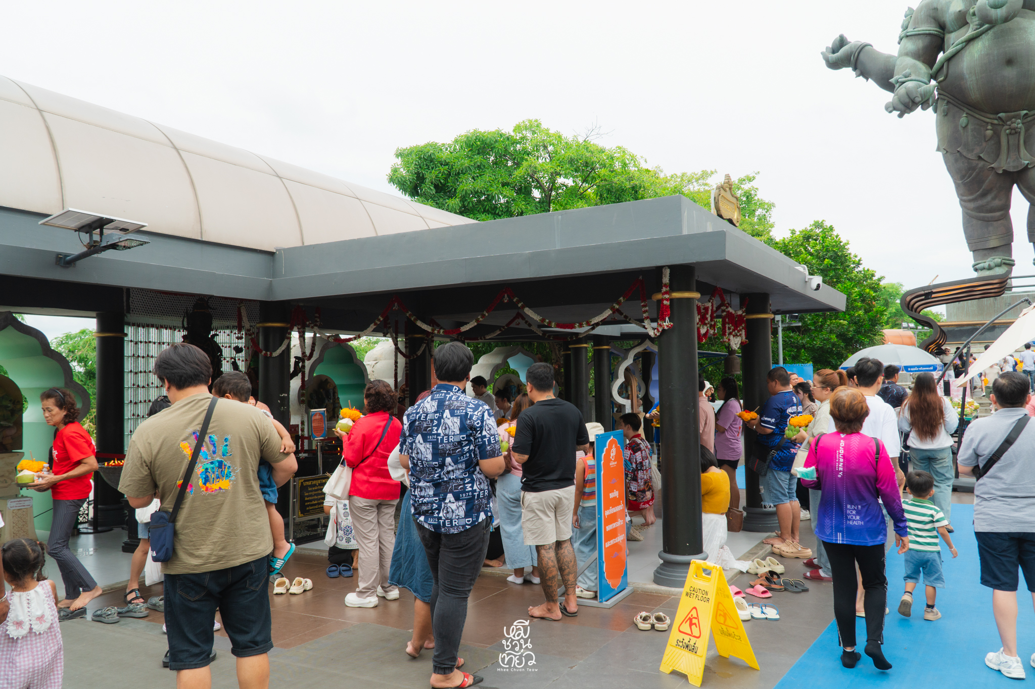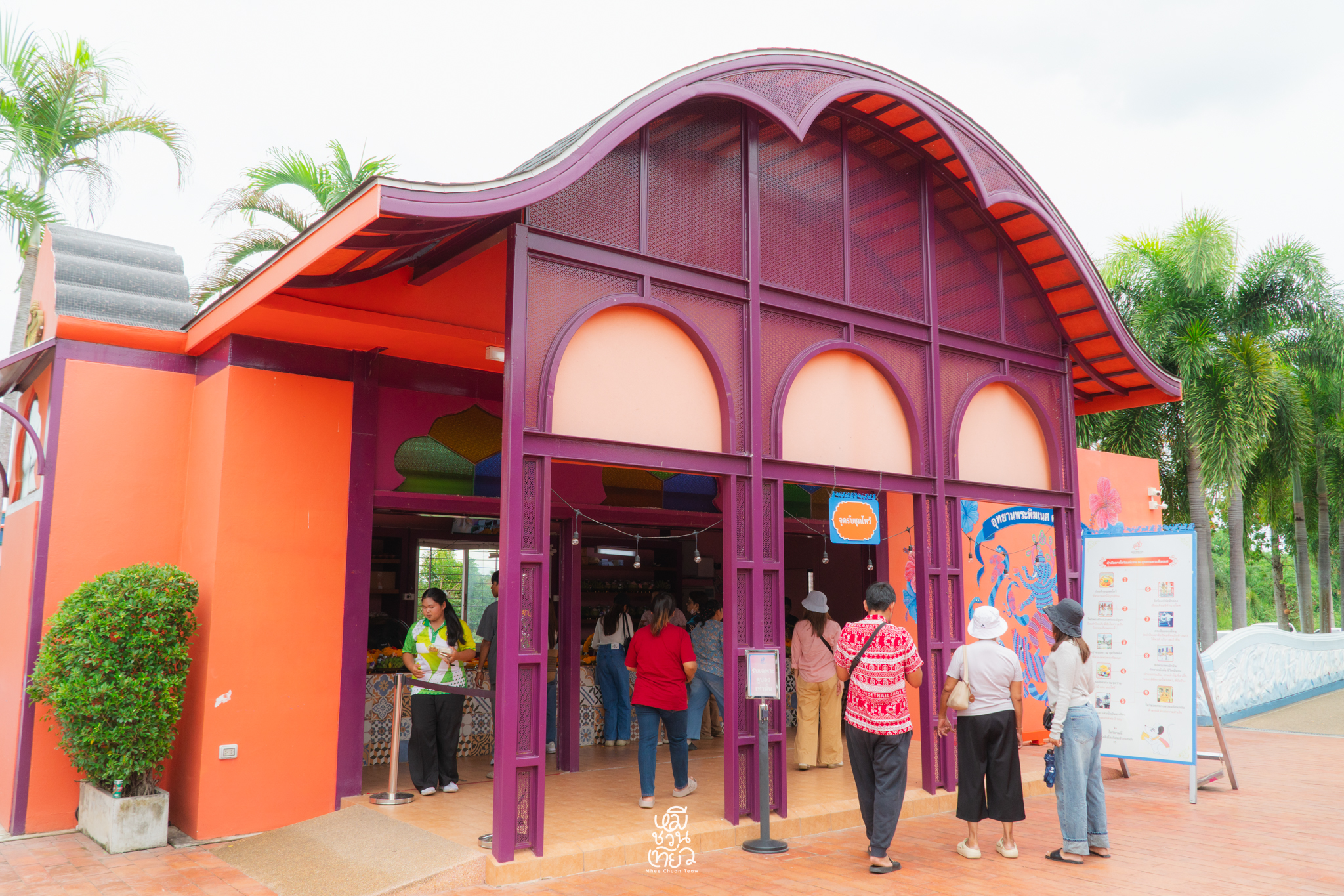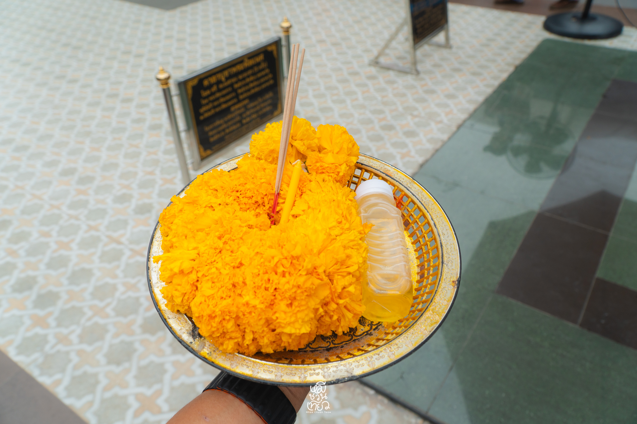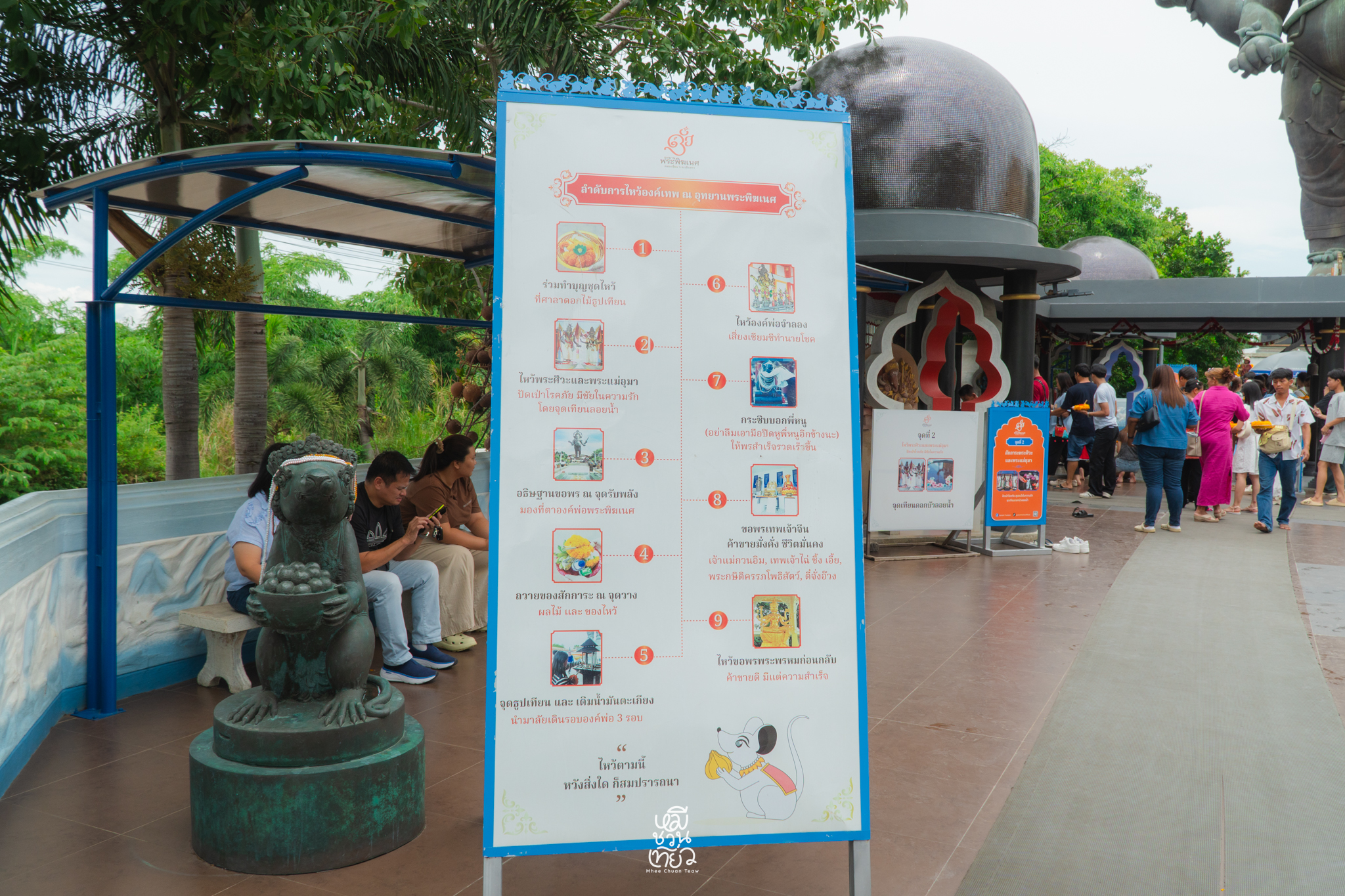 - เมื่อเดินเข้ามาในลานใหญ่ ด้านซ้ายมือจะมีจุดบริการชุดไหว้ครบชุด พร้อมป้ายแนะนำ ขั้นตอนการไหว้ อย่างละเอียด